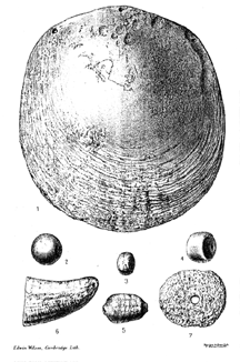 Edwin Wilson, Cambridge.Luh. | Figure 1.-- Pearl shell breastplate, or tiaf papa Figs. 2, 3, 4 , 5.--Whale's-tooth beads, or lei Figure 6.-- Whale's-tooth charm Figure 7.-- Muleli |
