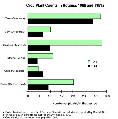 [8] The figure for 1960 derives from Howard's survey, during which 28 people were identified as Government employees. The 1992 data are from lists furnished by the Rotuma District Officer and Fiji Education Department. Of the 106 persons on the latter lists, there are 37 teachers, 16 medical staff, 14 Public Works employees, 13 individuals working for the District Administration, and 8 Water Supply workers; the remaining 18 were distributed among seven other Government departments (post & telecommunications, police, civil aviation, meteorology, agriculture, co-operatives, women & culture). [back to text]