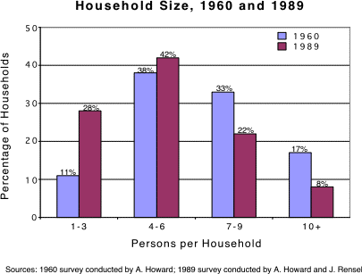 A comparison of findings from our 1989 and 1960 surveys gives additional insight into changes in household structure (see Table 3). The major change over the years has been a substantial increase in households composed of single persons or married couples (11.2% in 1989 compared to only 3.3% in 1960). Considering the fact that single individuals are not viable production units for subsistence purposes, the data on household structure would appear to support the interpretation offered above--that a number of households are occupied by caretakers for kinsmen abroad.