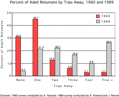 Support for the research on which the paper is based was received from several sources. The National Institute of Mental Health funded Howard's 1959-61 study. During the 1987-91 period he received funding from the Wenner-Gren Foundation, the University of Hawaii Office of Research Administration, and the University of Hawaii Program on Conflict Resolution (UHPCR). Rensel's research was sponsored in part by a Fulbright Grant administered by the Institute for International Education. We are indebted to the many Rotumans who have provided data, and especially the school teachers who conducted our 1989 household survey. The paper was originally presented at an Association for Social Anthropology in Oceania symposium on Pacific Migration, Kona, Hawai'i, March 24th-27th, 1993.