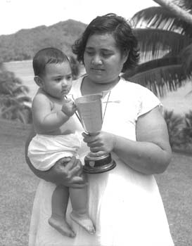 On 7 May 1960 the "Annual Baby Show" was held at Ahau.The competition was started by Fatiaki Taukave, who went to Rotuma as an Assistant Medical Officer in 1953. With the help of the District Officer, Taukave persuaded the chiefs to collect money to buy prizes for the healthiest babies and winning mothers. At the time, individual district shows were held in November, and all the prize-winning babies and children were brought together at the hospital in December for the main show. The district with the most points was ceremonially presented with a trophy cup, in addition to individual prizes. The idea caught on immediately and aroused a great deal of interest in modern baby care on the part of the mothers. It probably helped to reduce the high levels of infant mortality that afflicted Rotuma in earlier times. Sister Philip from Sumi was one of the judges. The babies were divided into two groups, those under two years old and those between two and five. Three prizes were given in each group. The district with the most points won the cup; in 1959 it was Itu'ti'u.
