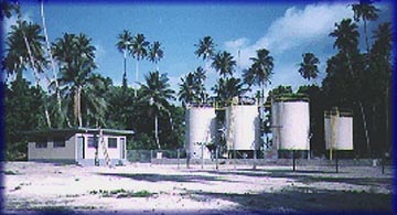 The Mobil Oil facility, opened in February 1997 by the President of Fiji, Ratu Mara. The tanks, located on the road to the village of Fapufa, hold fuel supplies which are pumped in by tankers anchored offshore via a pipeline that extends beyond the reef. The project was built at a cost of F$375,000. |