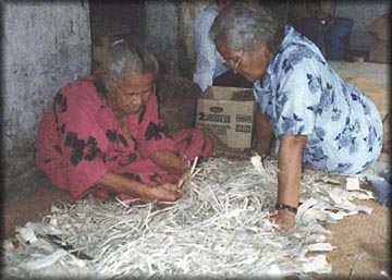 This photo is of Fiu, wife of Gagaj (Chief) Riamkau from the district of Juju, plaiting an apei (fine white mat), while Elizabeth Inia watches her technique.