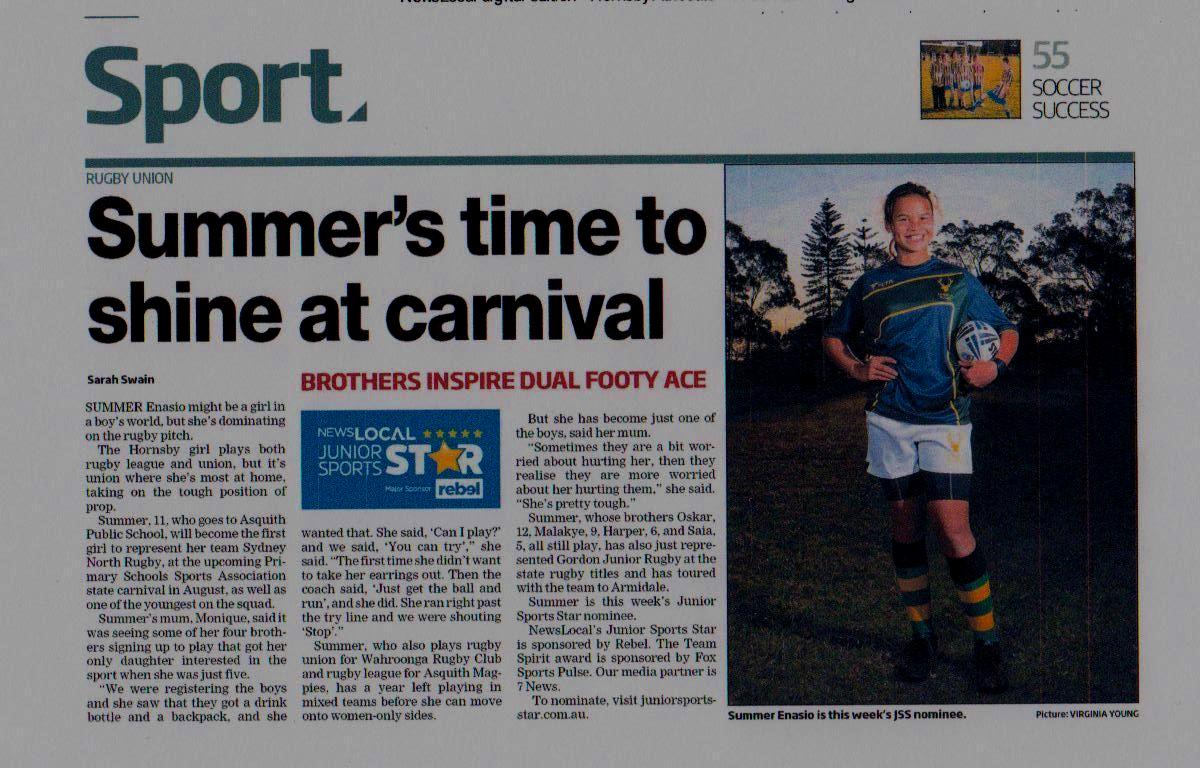 Summer Enasio was a Gordon Rep at last month's Under 12 National Rugby Championship where 150 teams competed and she won the Most Valuable Player Award. She will be touring Japan at the end of this
